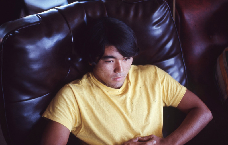 Pacific University student Bryan Matsumoto sitting down at a Haumana O Hawai'i (Hawaiian Club) event in the fall of 1971. This photograph appears to have been taken at the home of Professor Fred Scheller. Scheller was an advisor to Haumana O Hawai'i, and hosted many social events for Hawaiian students in his home around this time period. The original slide was printed in November, 1971.