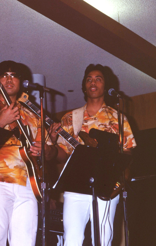 An audience watches a performer standing at the microphone next to a line of musicians, who are on stage at Pacific University's annual Lu'au in 1977. The student newspaper later described the musical performers at this Lu'au: "The band provided beautiful solos done by Danny Sagadraca, Lyle Galdeira, and Gary Pacarro. Music arrangements were provided by Keoki Awai. For the first time, the band featured a female vocalist. Ernette Barreira, a sophomore speech pathology major, sang with the band." (The Index, Apr. 28, 1977)
