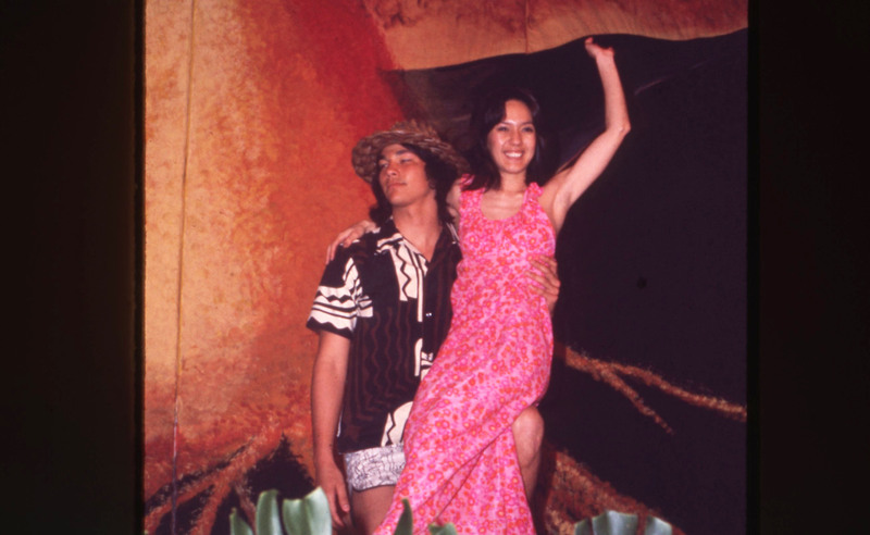 A male and female dancer at Pacific University's annual Lu'au in 1977. The man is wearing a white outfit with a green sash; the woman is wearing a colorful dress with a yellow lei.
