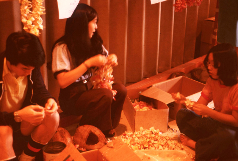 A female performer wearing pink orchids in her hair, backstage at Pacific University's annual Lu'au in 1977. Based on other sources from this event, this is likely "Ernette Barreira, a sophomore speech pathology major, [who] sang with the band" (The Index, Apr. 28, 1977).