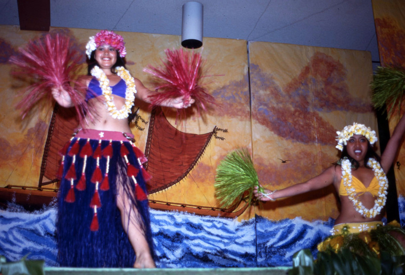 Two women students from Pacific University perform a Tahitian-style dance at the university's annual Lu'au in 1977. The original slide is labeled "Yanigitani," which may be the name of one of the performers, or may be the name of the photographer. The dancers holding hand tassels and wearing tasseled grass skirts.