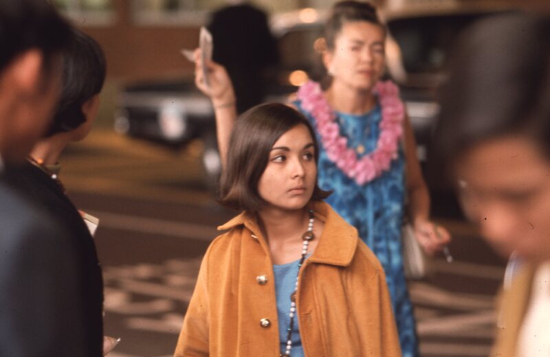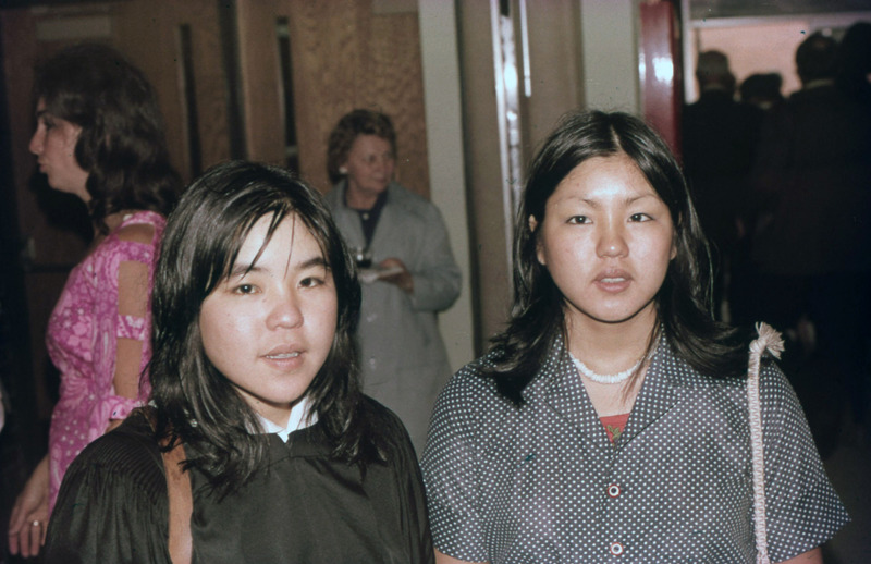 Jill Matsui (Pacific University Class of 1972) with a friend, both dressed semi-formally, during an event at Pacific circa 1970. For two other images taken at the same event, see PUA_LuauSlides_275 and PUA_PeoSlides_111.
