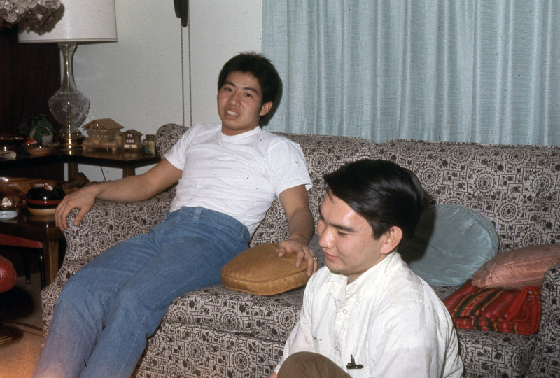 Joey Takahashi and another Pacific University student at a Haumana O Hawai'i (Hawaiian Club) social event, probably in October 1970. This photograph was likely taken at the home of Professor Fred Scheller, who lived in Aloha, Oregon. Scheller was an advisor to Haumana O Hawai'i, and appears to have hosted many social events for Hawaiian students around this time period. The original slide is labeled: "Haw. 1970."