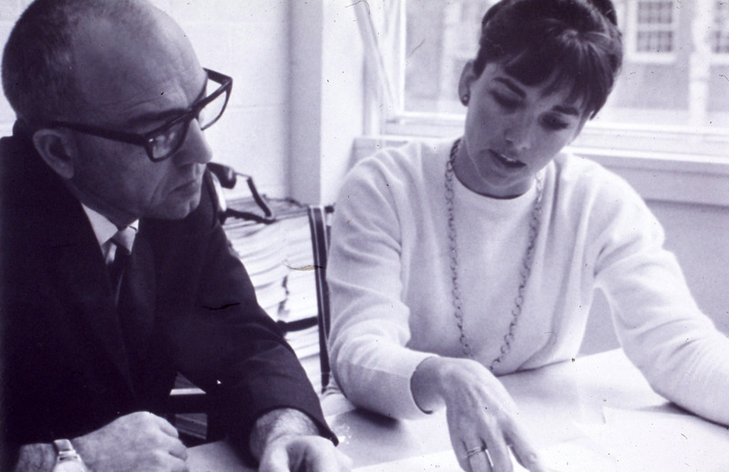 Pacific University Professor Fred Scheller, who taught radio and television media production, with a woman who may have been a student or staff. The two are examining papers on a table. This photograph was likely taken circa 1970.