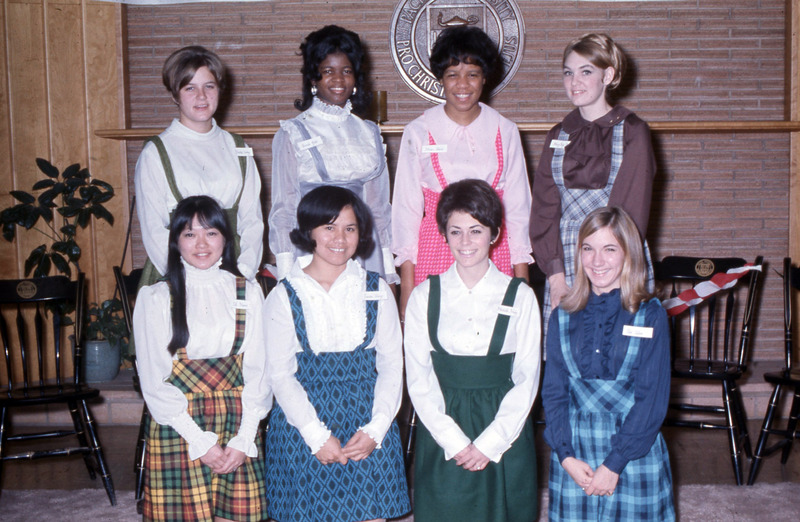 A group portrait of Pacific University women students wearing coordinating outfits. They are wearing name tags, but the names are not legible. The woman wearing green and red plaid on the bottom left is Jill Matsui (Class of 1972); the woman next to her wearing black and blue is Juanita Chang (Class of 1972); the woman wearing pink plaid is Linda Jenkins. This photograph may show the women who were elected to Pacific's Homecoming Court in 1970. Matsui was crowned Homecoming Queen that year, and Jenkins was chosen as the Black Student Union's representative on the Homecoming Court. For two other images taken at the same event, see PUA_LuauSlides_275 and PUA_PeoSlides_112.