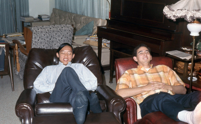 Two Pacific University students relaxing on recliners at Professor Fred Scheller's house in Aloha, Oregon, circa 1970. Scheller was an advisor to Haumana O Hawai'i (Hawaiian Club), and appears to have hosted many social events for Hawaiian students around this time period.