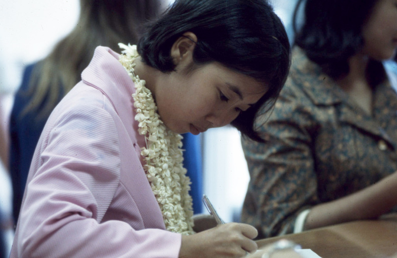 Joey Takahashi, a member of Haumana O Hawai'i (Hawaiian Club) of Pacific University, wearing a lei made of small white flowers while writing. This photograph was likely taken circa 1970, at either one of the university's annual Lu'au celebrations, or at another performance organized by Haumana O Hawai'i.