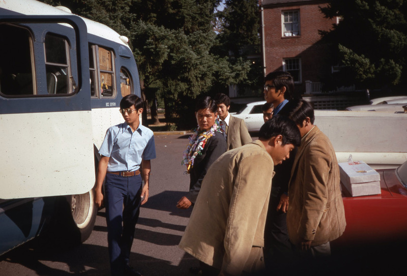 A group of Pacific University students from Haumana O Hawai'i (Hawaiian Club), apparently moving packages or luggage out of a bus. They are identified on the original slide from left-to-right as: Eric Chu (Class of 1974), John Hew (Class of 1975), Carl Itamura (Class of 1974), Cary Nishizawa (Class of 1974), and Alan Okamoto. Walter hall appears in the background. The original slide was printed in November 1970. This image probably shows the preparations for a performance hosted by Haumana O Hawai'i at Homecoming in late October of that year.