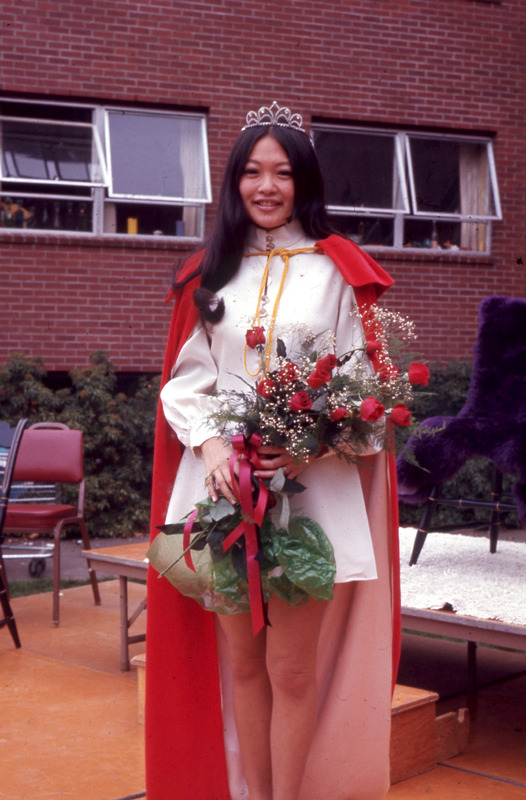 Pacific University student Jill Matsui (Class of 1972) just after her crowning as Homecoming Queen in late October, 1970. She is wearing a tiara, a red cape and a white dress, and is holding a large bouquet of flowers. According to the Pacific University student newspaper, the crowning ceremony took place between McCormick and Walter Halls. (The Index, Nov. 2, 1970, p. 1)