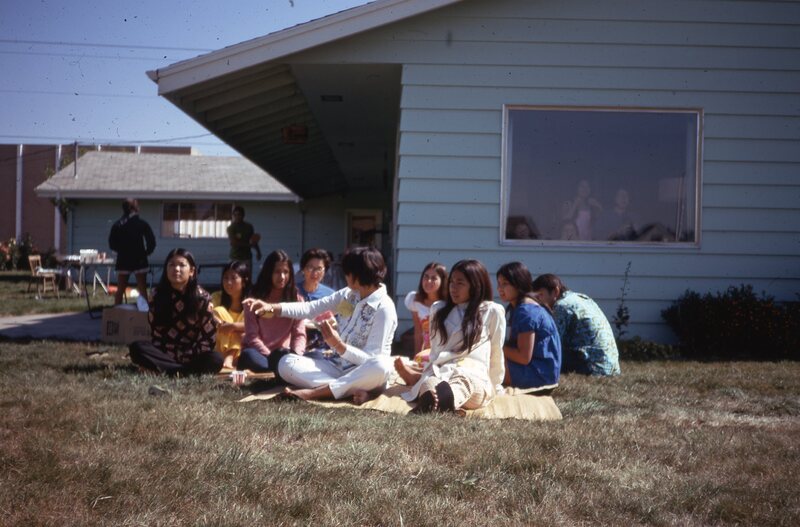 Pacific University student Sue Jan Chu at a Haumana O Hawai'i (Hawaiian Club) event in the fall of 1970. This photograph was likely taken at the home of Professor Fred Scheller, who lived in Aloha, Oregon. Scheller was an advisor to Haumana O Hawai'i, and appears to have hosted many social events for Hawaiian students around this time period.