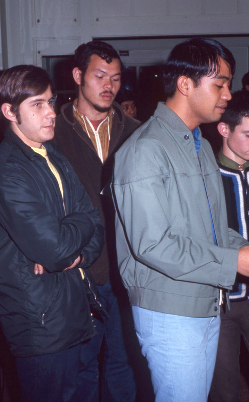 Pacific University students at a Haumana O Hawai'i (Hawaiian Club) event in the fall of 1970. The image is blurry. Three of the students are identified on the original slide as: Guy Nishizawa (Class of 1974); Carl Itamura (Class of 1974); and Sherman Cruz. This photograph was likely taken at the home of Professor Fred Scheller, who lived in Aloha, Oregon. Scheller was an advisor to Haumana O Hawai'i, and appears to have hosted many social events for Hawaiian students around this time period.