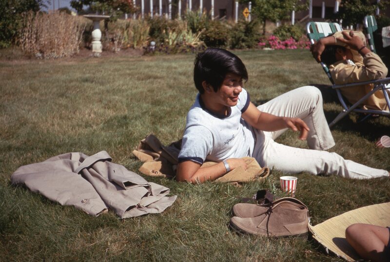 Pacific University students Sharon Nonaka (Class of 1974) and Roy Shimizu (Class of 1972) at a Haumana O Hawai'i (Hawaiian Club) event in the fall of 1970. They are relaxing in the sun while eating watermelon. This photograph was likely taken at the home of Professor Fred Scheller, who lived in Aloha, Oregon. Scheller was an advisor to Haumana O Hawai'i, and appears to have hosted many social events for Hawaiian students in his home around this time period.