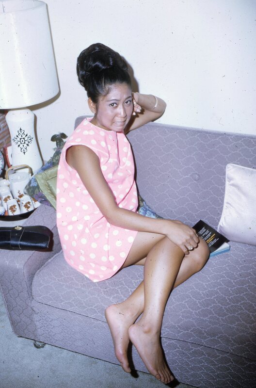 An Asian-American student from Pacific University, wearing a polka-dot minidress and grimacing at the camera. This slide was printed in October, 1968. Based on other slides that appear to be related, this image may have been taken at an event connected to Haumana O Hawai'i (Hawaiian Club); probably in the home of club advisor Professor Fred Scheller in Aloha, Oregon.