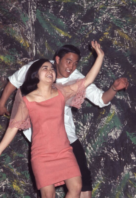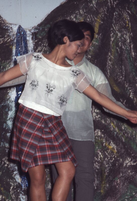 A Tinikling dance performance at Pacific University's annual Lu'au in 1968. Tinikling (or tiniclín) is a traditional Filipino folk dance. The two performers in the center are dancing over a bamboo pole, which is being held by other performers. The woman is wearing a dress with puffed sleeves, similar to the traditional Filipino balintawak; the man is wearing an untucked shirt, similar to the traditional barong.