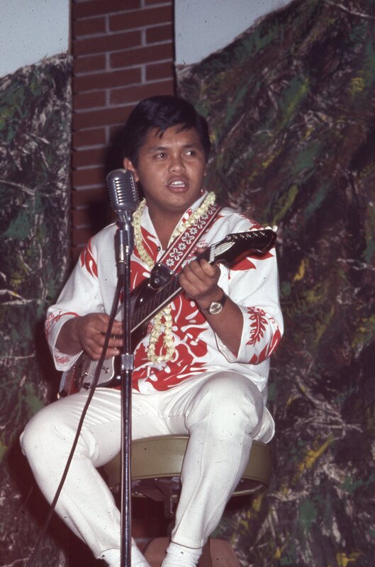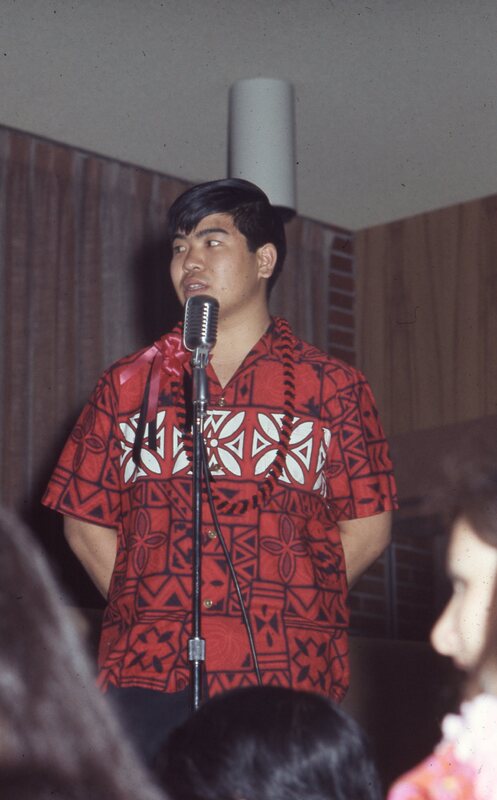 A man, probably a Pacific University student, speaking at a microphone during Pacific University's annual Lu'au in 1968. He may have been an announcer or emcee for the event.