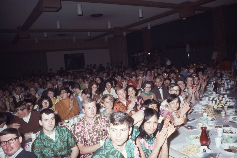 A wide view of the audience in attendance at Pacific University's annual Lu'au in 1968. Many of those present were students; others include the families of the Lu'au performers, university staff and local community members. Much of the audience is dressed for the occasion in colorful aloha shirts, muumuus, and leis. The remains of the kalua pig dinner that was served at each Lu'au are on the tables. This photograph was taken in Washburne Hall. The image is somewhat overexposed by the flash from the camera.