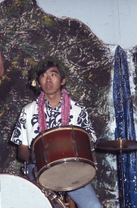A gathering on stage of all the performers from Pacific University's annual Lu'au in 1968, including dancers and musicians. This photograph was taken in Washburn Hall.
