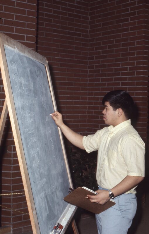 A student writing on a chalkboard, backstage at the university's annual Lu'au in 1968. He is writing down the expenses for various items in the event's budget, including the costs for transportation, publicity, concessions, food, costumes, and so on.