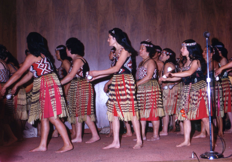 Female Pacific University students and parents performing a Maori-style dance in October, 1967. A note on the back of a matching slide identifies this event as having occurred at a "Frosh Dance" on campus. The performance was likely organized by the students' Hawaiian Club, Haumana O Hawai'i.