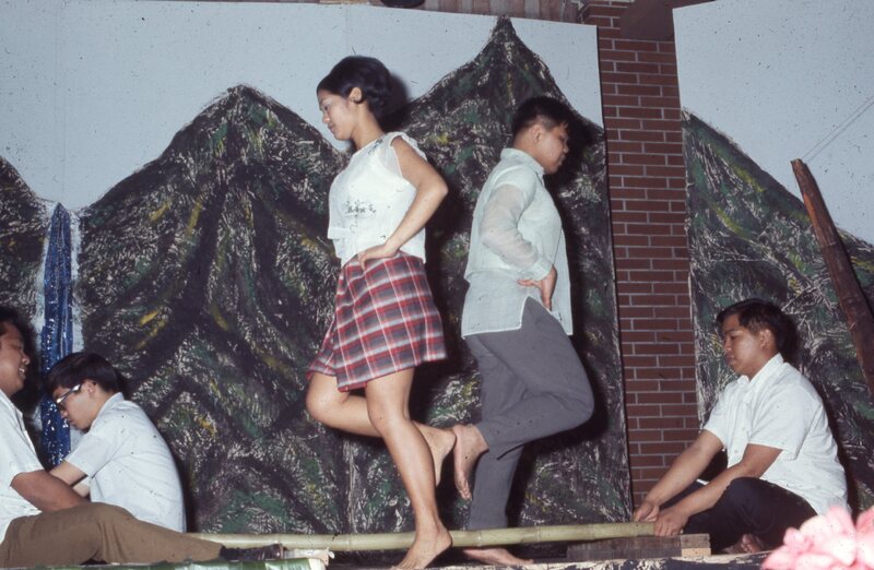 A Tinikling dance performance at Pacific University's annual Lu'au in 1968. Tinikling (or tiniclín) is a traditional Filipino folk dance. The two performers in the center are dancing over a bamboo pole, which is being held by other performers. The woman is wearing clothes similar to the traditional Filipino patadyong, or wraparound skirt; the man is wearing an untucked shirt, similar to the traditional barong.
