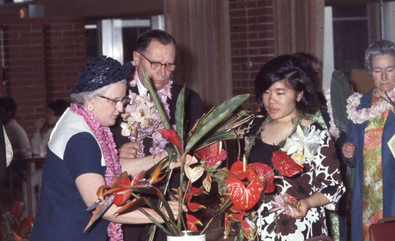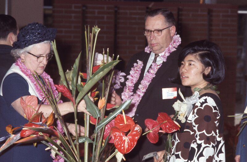 An older couple purchasing flowers from a vendor at Pacific University's annual Lu'au in 1968. According to his name tag, the man is Sidney Chaffee. The Haumana O Hawai'i Club, which hosted the event, organized air shipments of fresh flowers, fruit, and other goods from Hawaii to sell at vendor tables during the event.