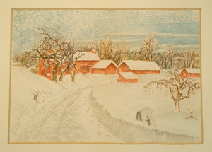 A photograph of four Pacific University students posed around a snowman, after a recent snowfall. The bottom of the snowman has the message 'In Memory Our Boy Bill'. This picture appears in an album that was compiled by Greta McIntyre Sheeley, a 1920 Pacific University graduate.