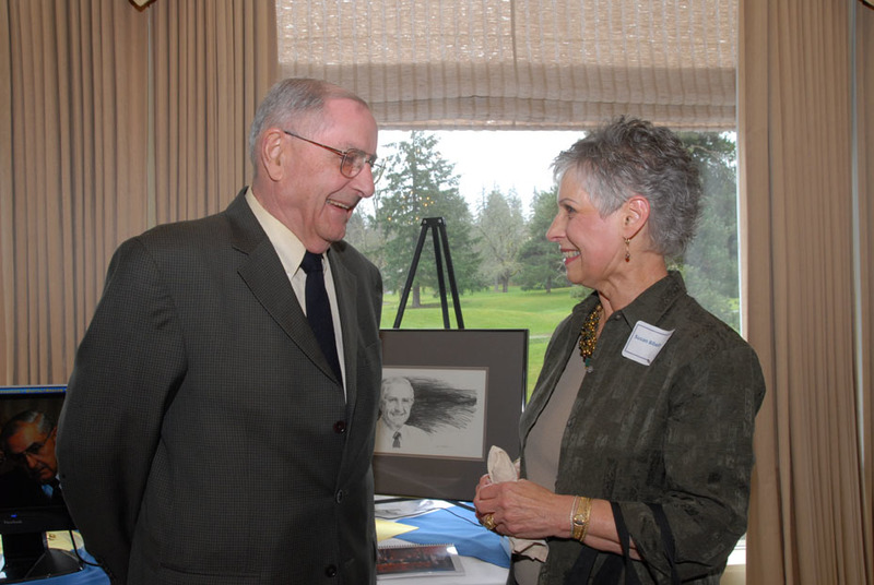 Victor Atiyeh talking with Susan Bibelheimer at a reunion for his former staff. This is one of a set of photographs taken by Gerry Lewin, a photographer for the Salem Statesman Journal.
