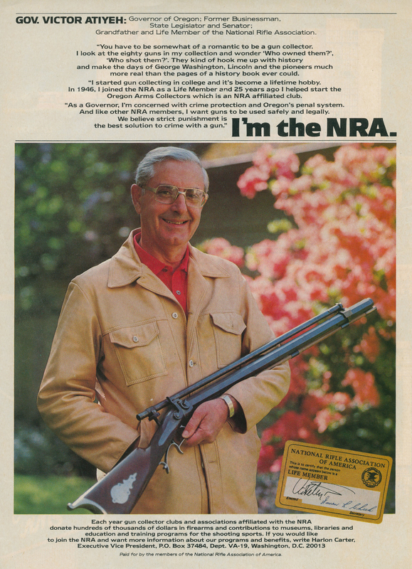 An advertisement in favor of the National Rife Association (NRA) featuring Governor Atiyeh. It includes some of the reasons that Atiyeh supported the NRA. This advertisement ran in national magazines such as The Smithsonian in about 1984.