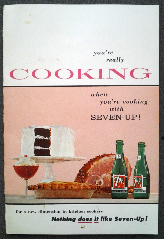 The cover of a small cook book issued by the Seven-Up company. The book includes recipes featuring the brand's soda, for dishes such as '7-Up Fish Fillets,' '7-Up Baked Beans,' and '7-Up Cheese Aspic.'