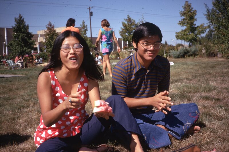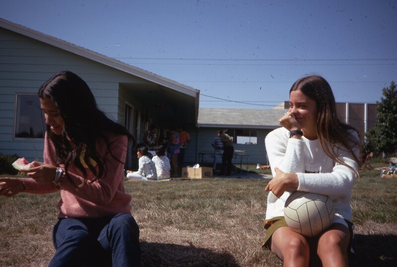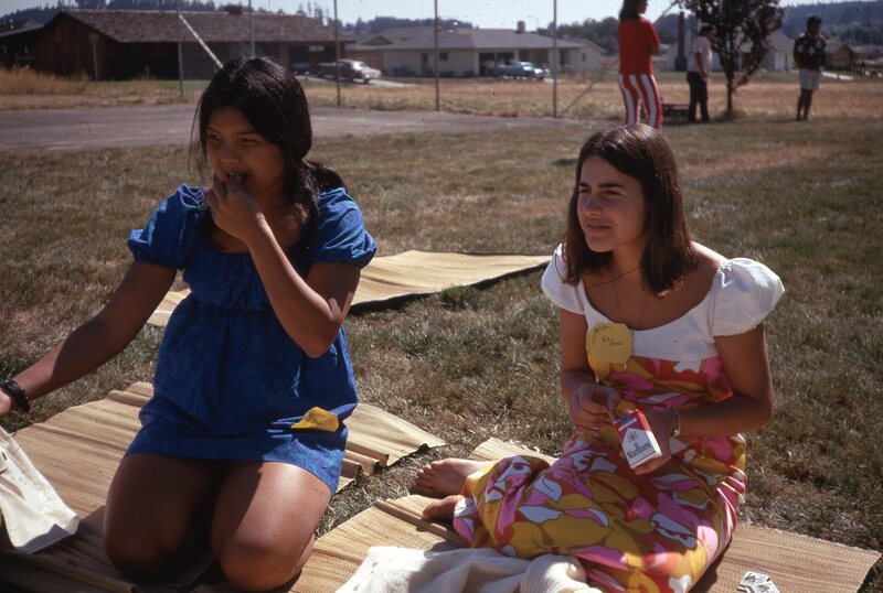 Pacific University students Wanda Fountain (Class of 1974) and Vicki Nicassio (Class of 1974), sitting on mats outdoors on the university's campus in the Fall of 1970. They are at a social event hosted by Haumana O Hawai'i (Hawaiian Club).