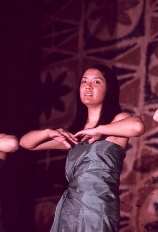 Pacific University student Mia Akau performing at the 1970 Haumana O Hawai'i Homecoming Dance. She is wearing a Tahitian-style costume with a purple grass skirt.