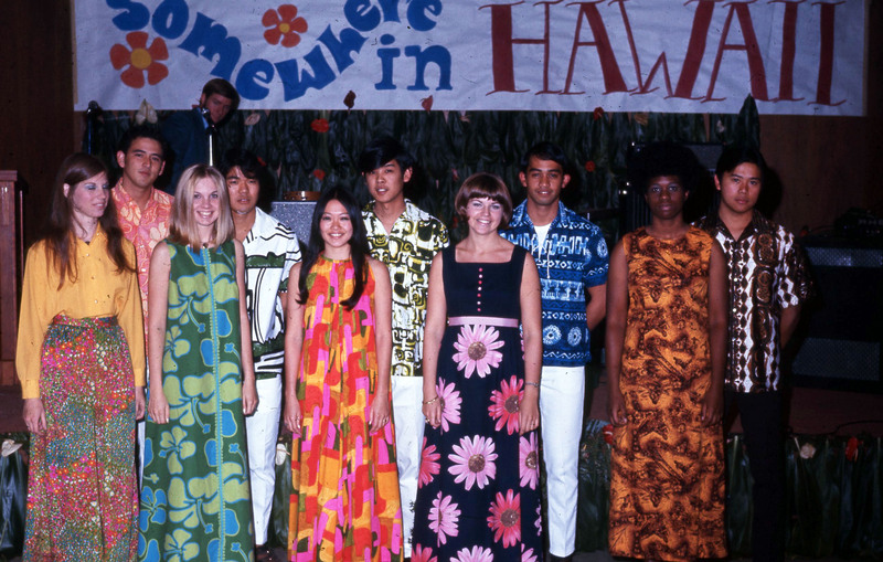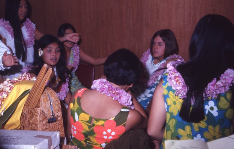 Pacific University student Jill Matsui (wearing red, pink and orange dress), who had just been crowned Homecoming Queen, on stage at the Haumana O Hawai'i Homecoming Dance in October, 1970. She is flanked by the women who had been elected members of her "Court", including: Marcia Englund; Linda Jenkins (wearing dark orange and black); Mary Ann Lazelle; and Lynette Sites. Attendants who were members of Haumana O Hawai'i (Hawaiian Club) stand behind them. A banner announcing the theme of the dance performance, "Somewhere in Hawaii", hangs in the background.