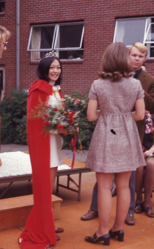 Pacific University student Jill Matsui just after her crowning as Homecoming Queen in late October, 1970. She is wearing a tiara, a red cape and a white dress, and is holding a large bouquet of flowers. According to the Pacific University student newspaper, the crowning ceremony took place between McCormick and Walter Halls. (The Index, Nov. 2, 1970, p. 1)