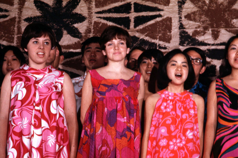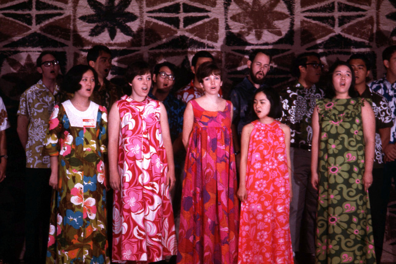 Chorus singers performing at Pacific University's annual Lu'au in 1969. According to the student newspaper, the event featured "a newly organized Hawaiian choir that will sing traditional Hawaiian and modern songs."