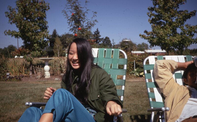 Pacific University student James Nakamura (Class of 1972), lying on a mat outdoors on the university's campus in the Fall of 1970. He is at a social event hosted by Haumana O Hawai'i (Hawaiian Club).