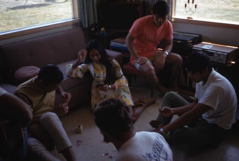 Pacific University students, most or all of whom were part of Haumana O Hawai'i (Hawaiian Club), playing cards in 1970. A note on the original slide identifies them as: Bayard Doane; Les Howell; Gerry Yoshida; and Brian Yamamoto. This may have been taken during a club meeting or event.