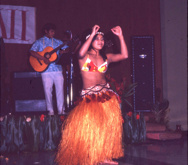 Pacific University student Wanda Fountain (Class of 1974) performing at the 1970 Haumana O Hawai'i Homecoming Dance. She is wearing a Tahitian-style costume with a grass skirt. Musicians are visible in the background.