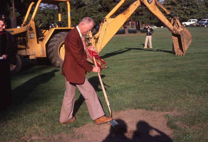 Ralph H. Shumm, Chair of Pacific University's Board of Trustees, using a golden shovel at the groundbreaking of Pacific's Murdock Hall in early October, 1979. The man observing on the left appears to be University President James Miller. The event was described in the student newspaper as a "ground-breaking ceremony for the $1.5 million chemistry wing of Pacific's new science facility" (The Index, Oct. 12, 1979).
