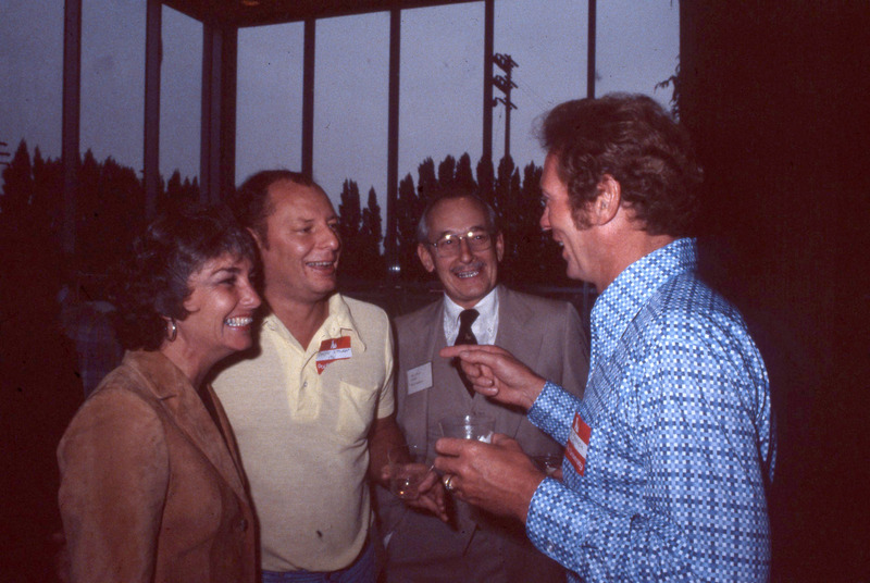 Attendees at a reception for Pacific University alumni in October 1979, probably held during Homecoming weekend. The man in pale yellow is Douglas Stewart (Class of 1961). The man with the tie is Pacific's President, James Miller. The man in blue has a name tag that reads "French," but his first name is not visible. The photograph was likely taken in Washburne Hall. The original slide has a handwritten note: "By Elwyn Williams." Williams apparently took the photo, but he was also in the ceremony: he was the Vice President of University Relations and per the newspaper, took part in the event.