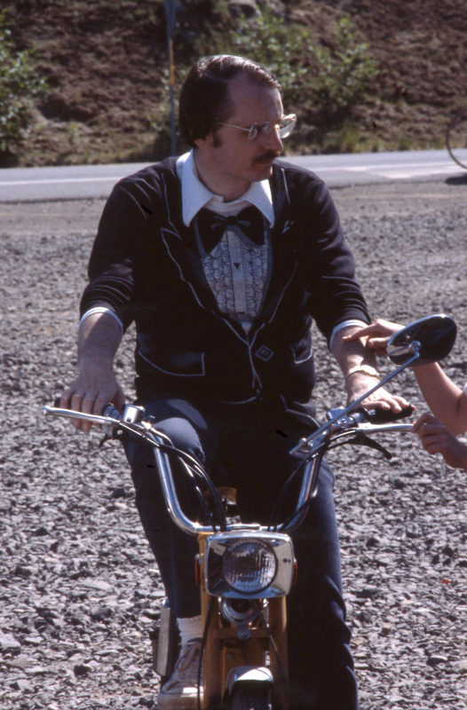 A man on a bicycle, wearing a sweater that has been fashioned to look like a tuxedo. Based on other images of the same person, he was probably a Pacific University staff photographer and/or a student worker who did photography for the university. The original slide was printed in June, 1979.