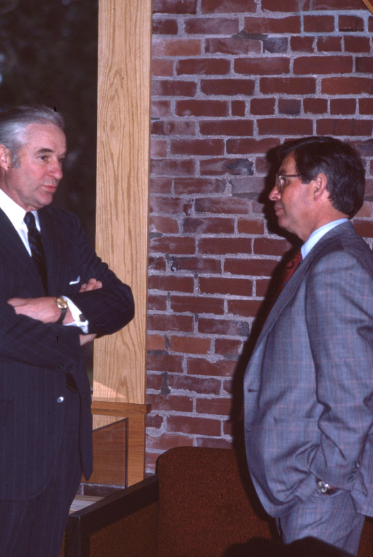 Leland H. Johnson (left), Treasurer Pacific University's Board of Trustees, while at a Trustees' meeting on the third floor of Marsh Hall. The man on the right is probably another Trustee. This is one of a set of photographs that were all taken during the same meeting. The original slide was printed in March, 1979.
