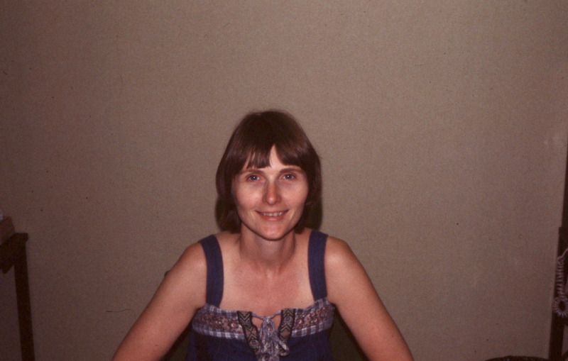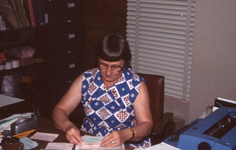 A woman, probably a librarian or clerical worker in the library at Pacific University. The same woman appears in image PUA_PeoSlides_266. The original slide was printed in July, 1979.