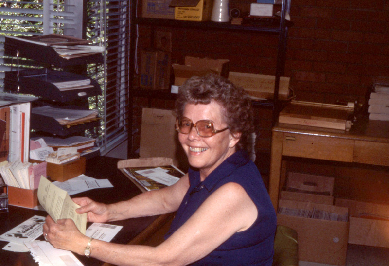 Professor Patricia Sobottka, who was a faculty librarian at Pacific University, in her office. Various library technical manuals are on the bookshelf behind her. The original slide was printed in July, 1979.