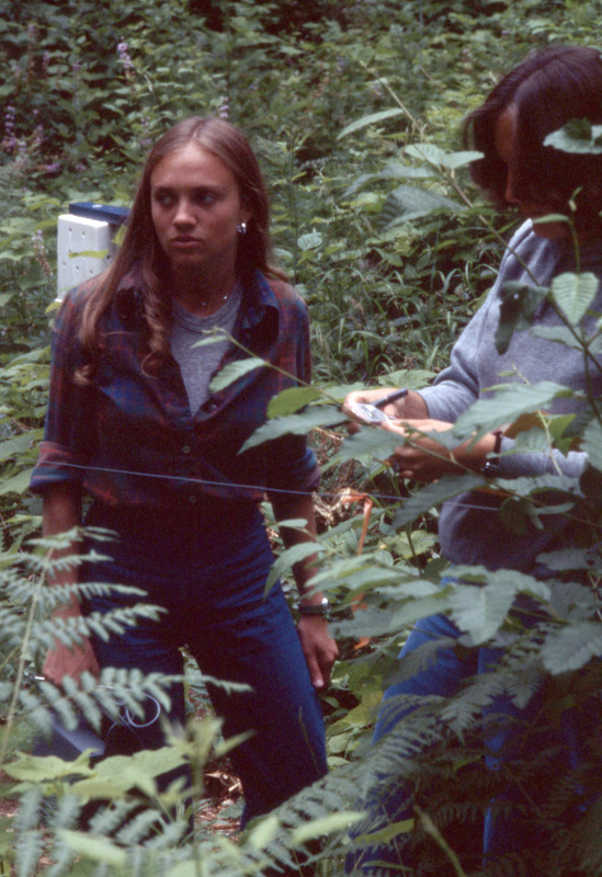 Two Pacific University students visiting a forest, among ferns, trees and flowers, probably near Forest Grove, Oregon. One student is examining a small device: possibly a compass or another instrument. This may have been taken during an environmental science course or during a field trip. The original slide was printed in July, 1979.