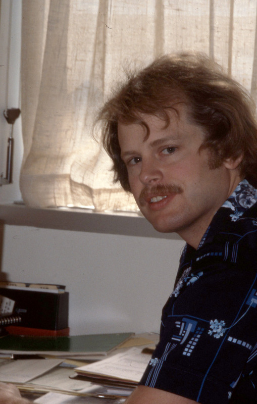 A man, probably a Pacific University student but possibly staff, apparently studying with stacks of notes in front of him. This may have been taken in his Pacific University dormitory room: the window treatments appear to match those in other dorm photographs from this time period. The original slide was printed in September, 1979.