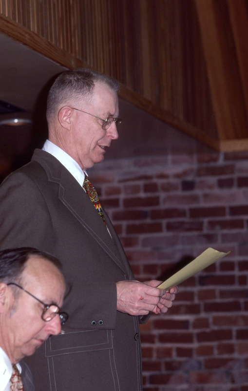 Professor Joe Story, who taught Economics, at a Pacific University Board of Trustees meeting on the third floor of Marsh Hall. This is one of a set of photographs that were all taken during the same meeting. The original slide was printed in March, 1979.