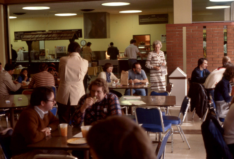 Pacific University staff and students eating in the cafeteria in Washburne Hall. The man with glasses sitting by a brown sack lunch is Professor Robert Davies. The original slide was printed in March, 1979.