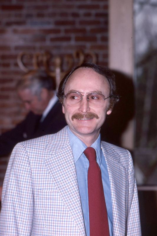 Professor Joe Story, who taught Economics, attending a Pacific University Board of Trustees meeting on the third floor of Marsh Hall. He appears to be carrying booklets to be distributed to the Trustees. This is one of a set of photographs that were all taken during the same meeting. The original slide was printed in March, 1979.