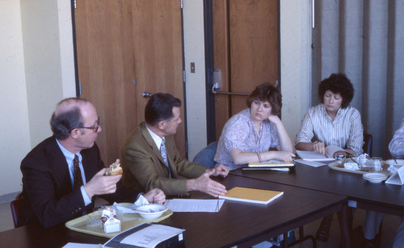 A meeting that appears to include members of Pacific University's faculty or administration as well as students and/or staff, held in Washburne Hall in March 1979. Trays from the cafeteria sit on the table, along with several copies of the same report. At that time, the university was in the midst of reforming its governance system; this meeting may have been held to discuss the issue (see The Index, Mar. 16, 1979). This is one of a set of several photographs taken at the same meeting.