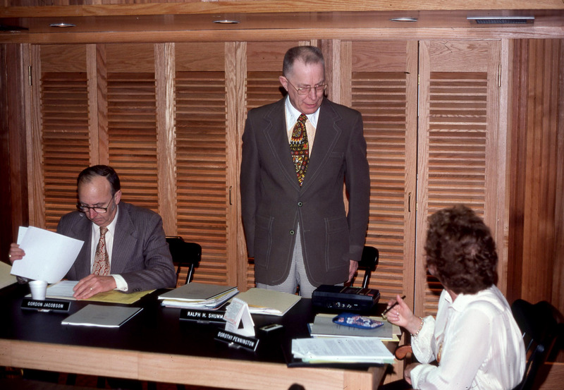 Ralph H. Shumm, Chair of Pacific University's Board of Trustees, attending a Trustees meeting on the third floor of Marsh Hall. Gordon Jacobson, Assistant Treasurer of the Board, is on the left. Dorothy Pennington, Secretary of the Board, is on the right. This is one of a set of photographs that were all taken during the same meeting. The original slide was printed in March, 1979.